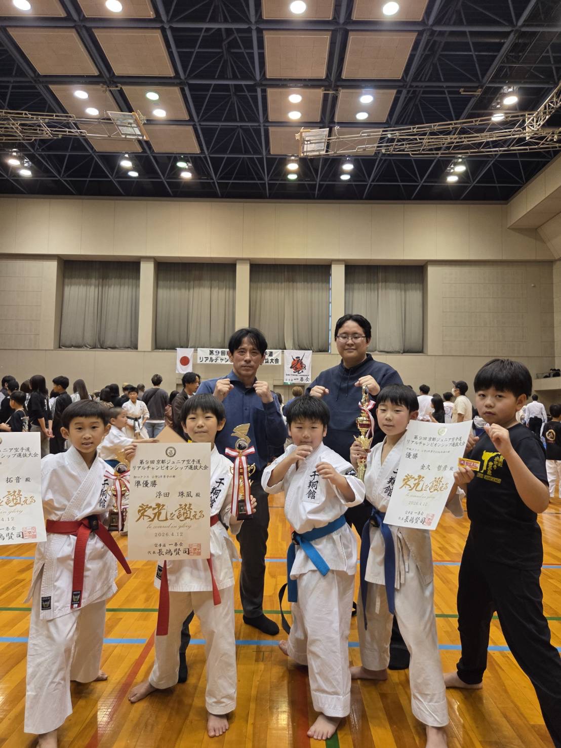 令和8年4月12日に京都の横大路運動公園体育館で開催された一拳会様主催の「第9回京都ジュニア空手道リアルチャンピオンシップ選抜大会」にテツヒコ、アオト、シュナ、タクト、ハルキの5名の選手が出場しました。出場した選手は本当に良く頑張りました。チャレンジする事の大切さを行動で体現してくれました。みんなナイスファイトでした。