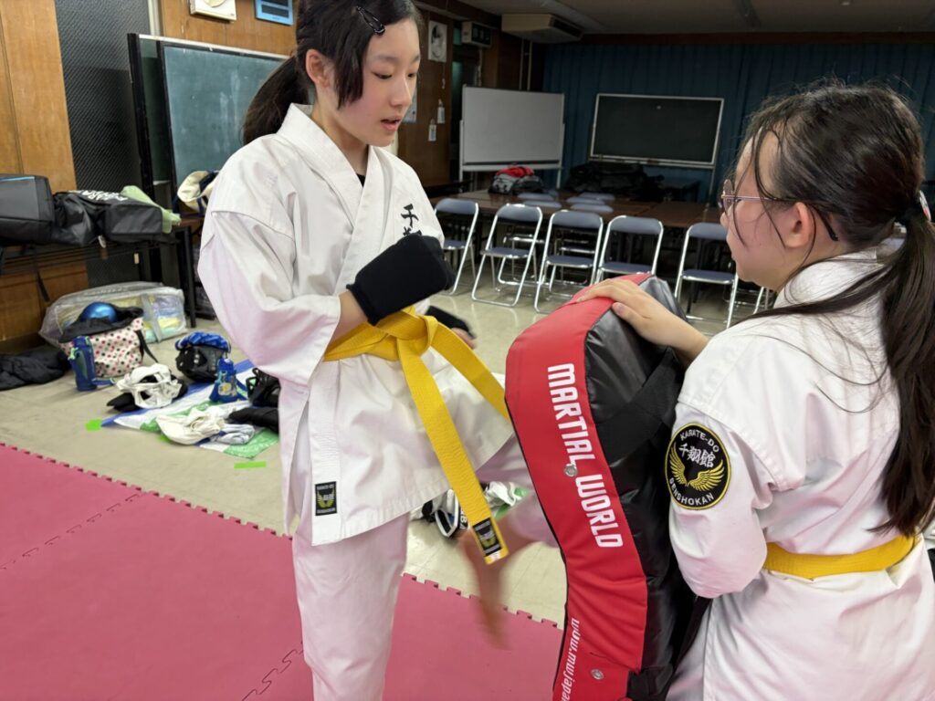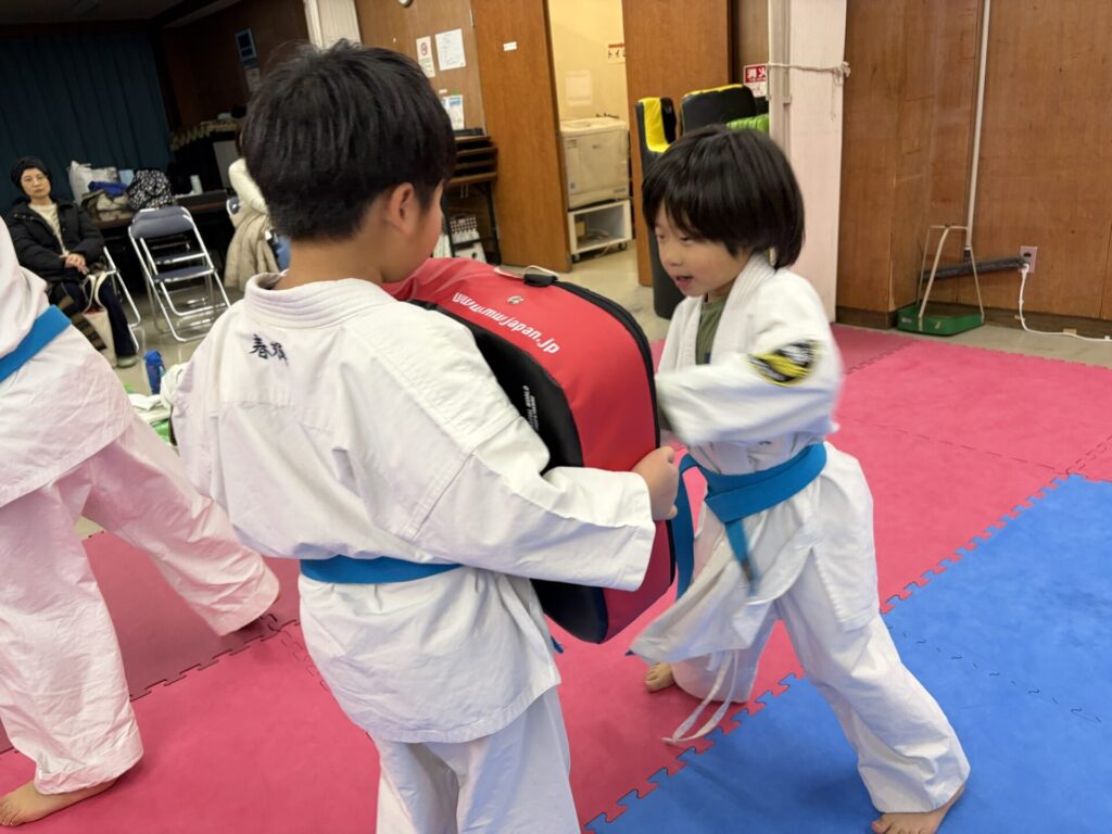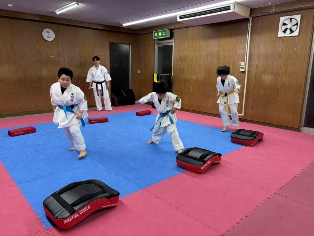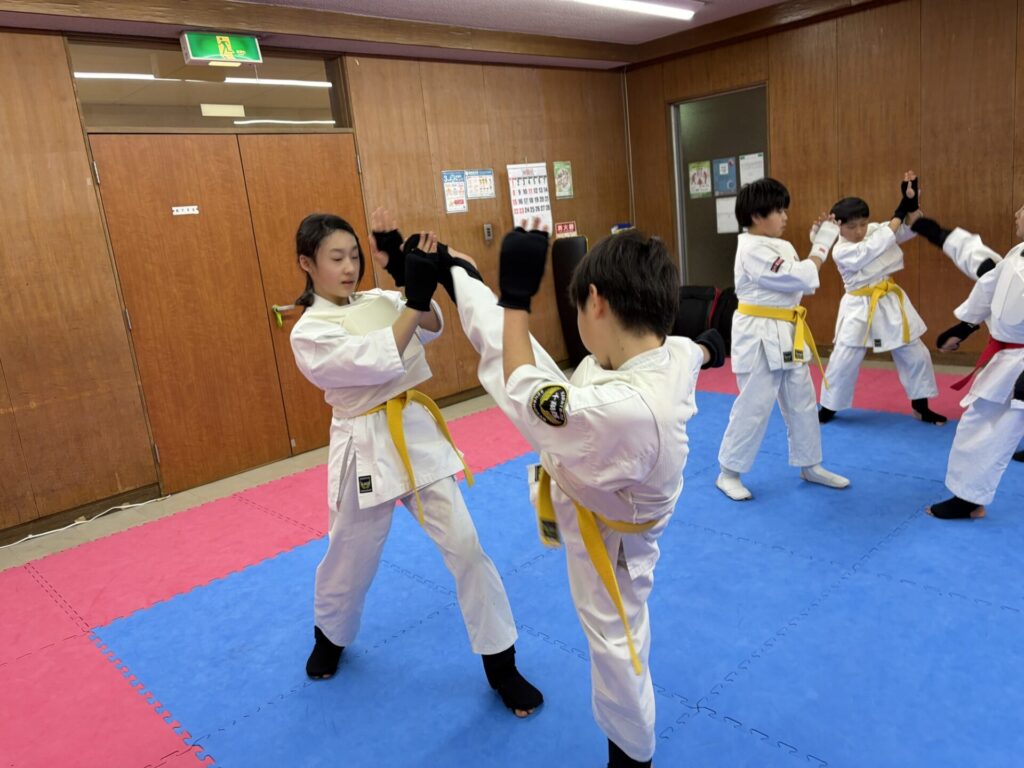突き蹴りの構えからフォームまで基本的な所を丁寧に指導しました。