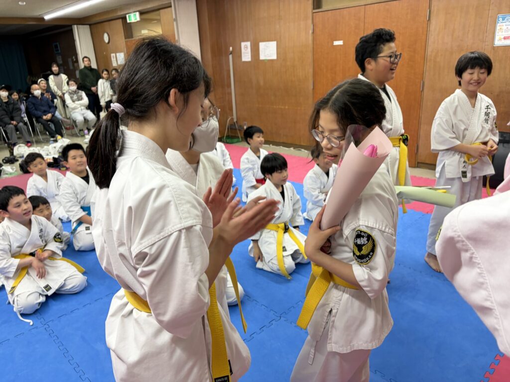 稽古の最後に5年生から6年生へ花束を渡すプチ卒業式を行いました。